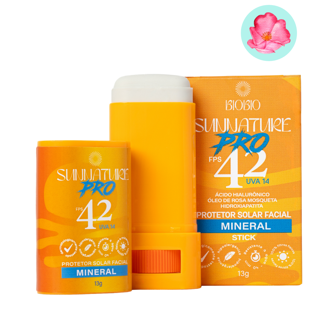 Com FPS 42, o Protetor Solar em Bastão Sunnature PRO foi formulado com filtros 100% mineral, além de diversos ativos de origem natural e resistência à água de 40 min.